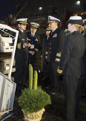 Keywords: Curtis Wilbur and Kirishima gift exchange 131219-N-TX154-024.jpg en Capt Yasuhiro Sato commanding officer of the Japan Maritime Self-Defense Force guided-missile destroyer JS Kirishima DDG 174 presents a Kadomatsu a traditional Japanese token of good fortune to Cmdr Hans De For and Cmdr Amy Graham commanding officer and executive officer of the guided-missile destroyer USS Curtis Wilbur DDG 54 during a Christmas gift exchange Curtis Wilbur and Kirishima have been sister ships since 1996 when Curtis Wilbur shifted to Yokosuka and have exchanged gifts every year for the past 17 years U S Navy photo by Mass Communication Specialist 3rd Class Paul Kelly/Released <br>Unit Navy Media Content Services 2013-12-19 Petty Officer 3rd Class Paul Kelly https //www dvidshub net/image/1142740/curtis-wilbur-and-kirishima-gift-exchange 131219-N-TX154-024 2013-12-20 19 37 FLEACT YOKOSUKA JP PD-USGov-Military-Navy USS Curtis Wilbur DDG-54 Images from DoD uploaded by Fæ |