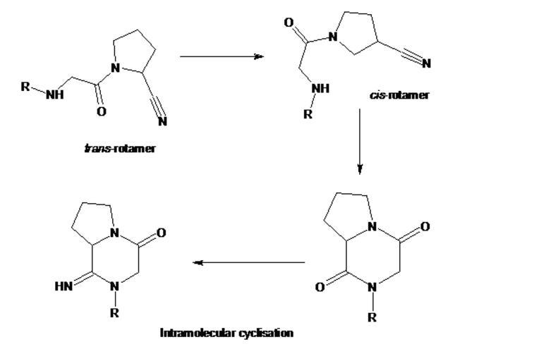 Keywords: Cyanopyrrolidines - chemical stability.png en Trans-rotamers are more stable then cis-rotamers Cis-rotamers undergo intramolecular cyclisation Own Dondli 2008-11-06 Organic reactions