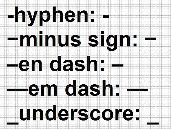 Keywords: Dashes.png text en Comparison of hyphens minus sign dashes and underscore The hyphen and underscore are keyboard characters There is a small space before and after the hyphen and the minus sign 2012-09-25 05 02 43 own Apteva cc-zero Uploaded with UploadWizard Punctuation Dashes Hyphens |