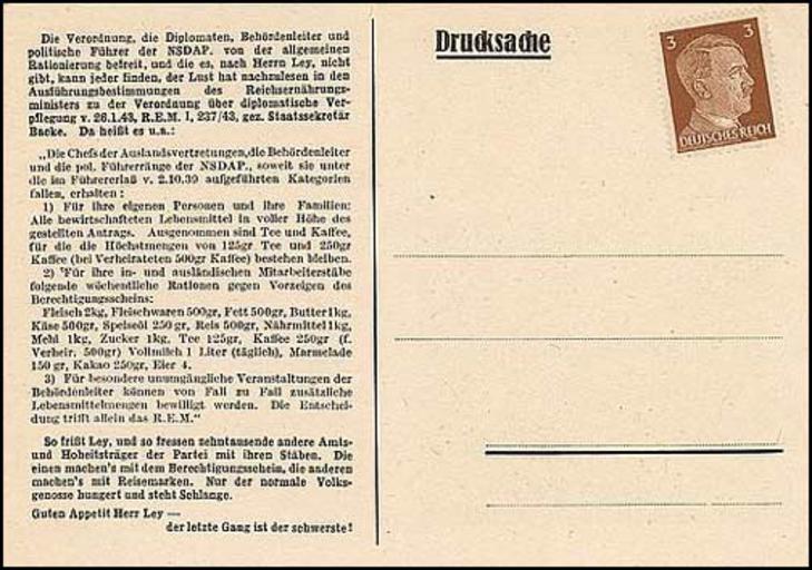 Keywords: Demoralization Leaflet Robert Ley Postcard back.jpeg en Back of US Government leaflet attempting to demoralize German enemy by showing that their leadership lived a much better life 1943 http //www psywarrior com/DivideandConquer html Federal Government PD-USGov World War II anti-German propaganda Uploaded with UploadWizard |