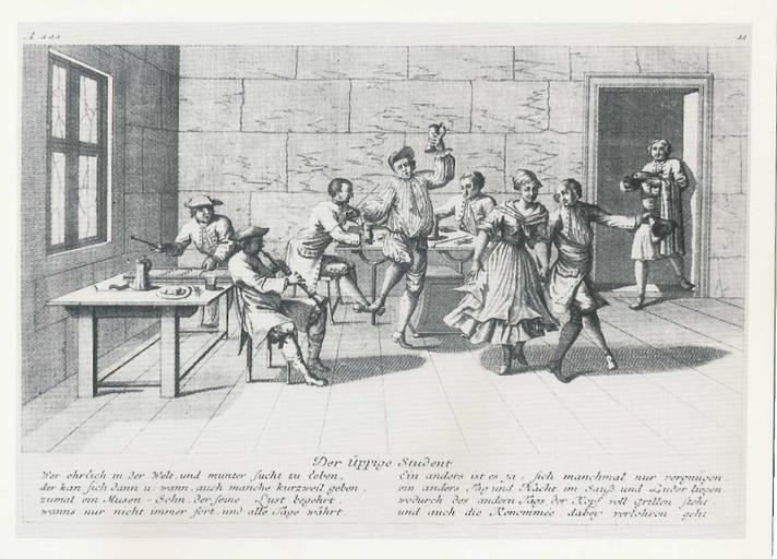 Keywords: Dendrono - Der üppige Student.jpg de Dendrono de Johann Georg Puschner Der üppige Student Kupferstich von 1725 Szenen aus dem Leben der Studenten an der de Universität Altdorf Der üppige Student Wer ehrlich in der Welt und munter sucht zu leben der kann sich dann u wann auch manche kurzweil geben zumal ein Musen-Sohn der seine Lust begehrt wanns nur nicht immer fort und alle Tage währt Ein anders ist es ja sich manchmal nur vergnügen Ein anders Tag und Nacht im Sauß und Luder liegen Wodurch des andern Tags der Kopf voll Grillen steht Und auch die Renommée dabey verlohren geht en Copper engraving of de Johann Georg Puschner alias Dendrono of 1725 The opulent student Altdorf University Germany 1725 Natürliche Abschilderung des academischen Lebens de Johann Georg Puschner PD-old-100 Uploaded with UploadWizard Students in art Students in Germany Academic dress in Germany 1720s engravings Natürliche Abschilderung des academischen Lebens Taverns in art 18th-century dancers |