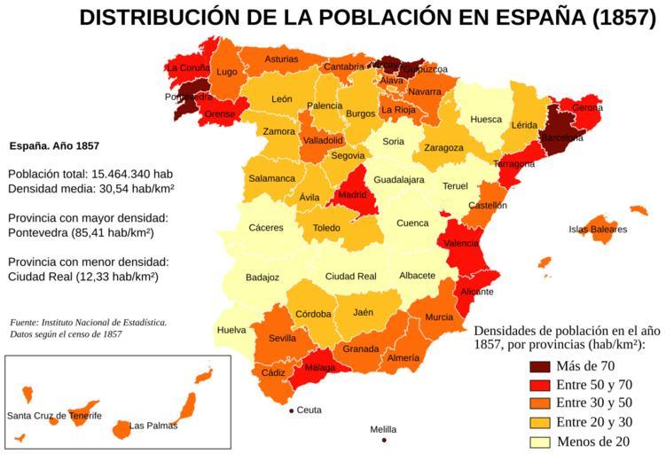 Keywords: Densidades de población en España (1857).svg Mapa de España con las densidades de población por provincias actuales según el censo del Instituto Nacional de Estadística de 1857 Instituto Nacional de Estadística de España Image Evolución Población Provincias España 1787 - 1900 pdf 2007 Creando por Rodriguillo tomando como mapa base Image Provinces of Spain svg creado por Emilio Gómez Fernández GFDL Image Densidades de población en España 1857 png Rodriguillo Population density maps of Spain Maps of the history of Spain 1857 in Spain |