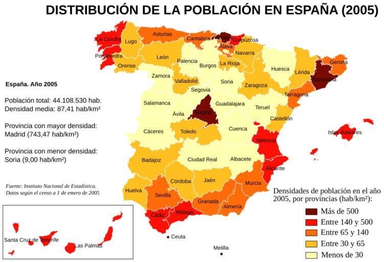 Keywords: Densidades de población en España (2005).svg Mapa de España con las densidades de población por provincias según el censo del Instituto Nacional de Estadística a 1 de enero de 2005 Instituto Nacional de Estadística de España http //www ine es/inebase/cgi/um M 2Ft20 2Fe260 O inebase N L 2007 Creado por Rodriguillo tomando como mapa base Image Provinces of Spain svg creado por Emilio Gómez Fernández Image Densidades de población en España 2005 png Rodriguillo Population density maps of Spain |
