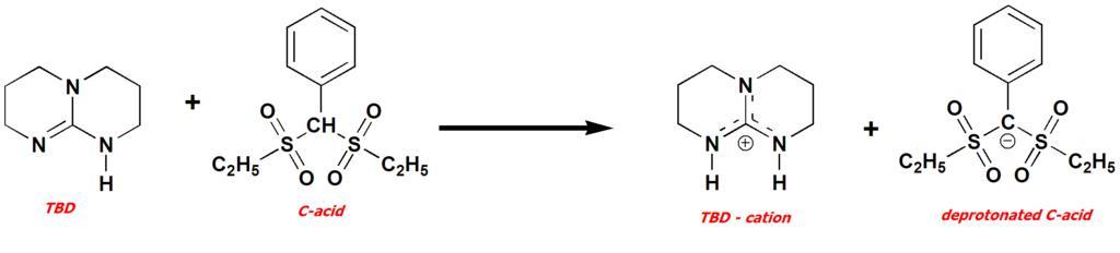 Keywords: Deprotonation of C-acid.png Deprotonation of C-acid by TBD N-base own 2008 Adamchemik All rights releasead Organic reactions Acid-base reactions