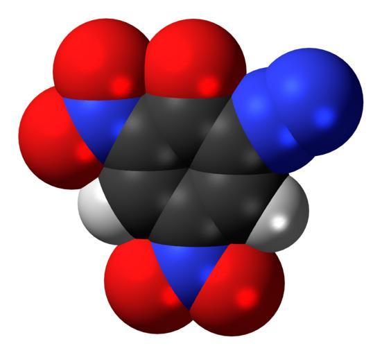 Keywords: Diazodinitrophenol-3D-spacefill.png Space-filling model of the diazodinitrophenol molecule an explosive nitro compound Colour code 505050 Carbon C black<br> F0F0F0 Hydrogen H white<br> F51E1E Oxygen O red<br> 3C50FA Nitrogen N blue<br> 2011-01-27 own DS Visualizer Jynto talk Ball-and-stick version cc-zero Diazo compounds Dinitrophenols Explosives Images by Jynto Space-filling models |