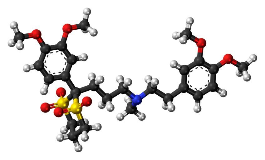 Keywords: Dimeditiapramine 3D ball.png Ball-and-stick model of the dimeditiapramine molecule a calcium channel blocker Colour code 505050 Carbon C black<br> F0F0F0 Hydrogen H white<br> F51E1E Oxygen O red<br> 3C50FA Nitrogen N blue<br> FAEB00 Sulfur S yellow<br> 2011-06-25 own DS Visualizer Jynto talk Space-filling version cc-zero Cyclic sulfones dimethoxybenzenes tertiary amines Images by Jynto Ball-and-stick models |