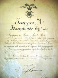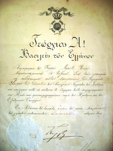 Keywords: Diploma from King George A.jpg el Α ονομή του Αργυρού Σταυρού του Βασιλικού Τάγματος του Σωτήρος για την μακράν και ευδόκιμον υ ηρεσία του μηχανικού Αριστείδη Έσσλιν α ό τον Βασιλιά Γεώργιο Α΄ en Document of award of the Silver Cross of the Royal Order of the Redeemer to Aristeides Esslin by King George I of Greece 1890-03-16 Aristeidis Esslin's Archive Royal chancellery PD-old Uploaded with UploadWizard Esslin family Order of the Redeemer Documents in Greek |