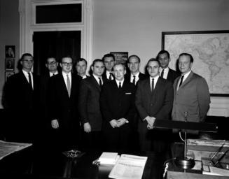 Keywords: u.s. national archives usnationalarchives jfk presidential library jfkpresidentiallibrary people groupshot blackandwhite monochrome black and white Original Caption: Director of Food for Peace, George McGovern, with Visitors We are looking for your help in identifying unknown people in our White House Photographs collection. If you have any information about this photograph, please post a comment, including any relevant sources, for the catalogers at the John F. Kennedy Presidential Library. Thank you! Local Identifier: JFKWHP-KN-17353 Created By: President (1961-1963 : Kennedy). Office of the Naval Aide to the President. (1961 - 1963) From: Robert Knudsen White House Photographs, 01/20/1961 - 12/19/1963 Contact: John F. Kennedy Library (LP-JFK), Columbia Point Boston, MA 02125-3398 Phone: 617-514-1600 Fax: 617-514-1652 Email: kennedy.library@nara.gov Production Dates: 3/17/1961 Scope and Content Note: This is a photograph of Director of Food for Peace and Special Assistant to the President, George McGovern (fourth from right), with ten unidentified men. Room 234, Executive Office Building, Washington, D.C. Persistent URL: JFK Library URL: www.jfklibrary.org/Asset-Viewer/Archives/JFKWHP-KN-17353.... Access Restrictions: Unrestricted Use Restrictions: Unrestricted Original Caption: Director of Food for Peace, George McGovern, with Visitors We are looking for your help in identifying unknown people in our White House Photographs collection. If you have any information about this photograph, please post a comment, including any relevant sources, for the catalogers at the John F. Kennedy Presidential Library. Thank you! Local Identifier: JFKWHP-KN-17353 Created By: President (1961-1963 : Kennedy). Office of the Naval Aide to the President. (1961 - 1963) From: Robert Knudsen White House Photographs, 01/20/1961 - 12/19/1963 Contact: John F. Kennedy Library (LP-JFK), Columbia Point Boston, MA 02125-3398 Phone: 617-514-1600 Fax: 617-514-1652 Email: kennedy.library@nara.gov Production Dates: 3/17/1961 Scope and Content Note: This is a photograph of Director of Food for Peace and Special Assistant to the President, George McGovern (fourth from right), with ten unidentified men. Room 234, Executive Office Building, Washington, D.C. Persistent URL: JFK Library URL: www.jfklibrary.org/Asset-Viewer/Archives/JFKWHP-KN-17353.... Access Restrictions: Unrestricted Use Restrictions: Unrestricted |