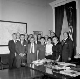 Keywords: u.s. national archives usnationalarchives jfk presidential library jfkpresidentiallibrary people groupshot blackandwhite monochrome black and white Original Caption: Director of Food for Peace, George McGovern, with Visitors We are looking for your help in identifying unknown people in our White House Photographs collection. If you have any information about this photograph, please post a comment, including any relevant sources, for the catalogers at the John F. Kennedy Presidential Library. Thank you! Local Identifier: JFKWHP-KN-19444 Created By: President (1961-1963 : Kennedy). Office of the Naval Aide to the President. (1961 - 1963) From: Robert Knudsen White House Photographs, 01/20/1961 - 12/19/1963 Contact: John F. Kennedy Library (LP-JFK), Columbia Point Boston, MA 02125-3398 Phone: 617-514-1600 Fax: 617-514-1652 Email: kennedy.library@nara.gov Production Dates: 11/14/1961 Scope and Content Note: In this photograph Director of Food for Peace George McGovern (back row, second from right) meets with 12 unidentified visitors. James A. Michener, co-chairman of the Food for Peace Council, stands to the left of McGovern. Food for Peace Office, Executive Office Building, Washington, D.C. Persistent URL: JFK Library URL: www.jfklibrary.org/Asset-Viewer/Archives/JFKWHP-KN-19444.... Access Restrictions: Unrestricted Use Restrictions: Unrestricted Original Caption: Director of Food for Peace, George McGovern, with Visitors We are looking for your help in identifying unknown people in our White House Photographs collection. If you have any information about this photograph, please post a comment, including any relevant sources, for the catalogers at the John F. Kennedy Presidential Library. Thank you! Local Identifier: JFKWHP-KN-19444 Created By: President (1961-1963 : Kennedy). Office of the Naval Aide to the President. (1961 - 1963) From: Robert Knudsen White House Photographs, 01/20/1961 - 12/19/1963 Contact: John F. Kennedy Library (LP-JFK), Columbia Point Boston, MA 02125-3398 Phone: 617-514-1600 Fax: 617-514-1652 Email: kennedy.library@nara.gov Production Dates: 11/14/1961 Scope and Content Note: In this photograph Director of Food for Peace George McGovern (back row, second from right) meets with 12 unidentified visitors. James A. Michener, co-chairman of the Food for Peace Council, stands to the left of McGovern. Food for Peace Office, Executive Office Building, Washington, D.C. Persistent URL: JFK Library URL: www.jfklibrary.org/Asset-Viewer/Archives/JFKWHP-KN-19444.... Access Restrictions: Unrestricted Use Restrictions: Unrestricted |