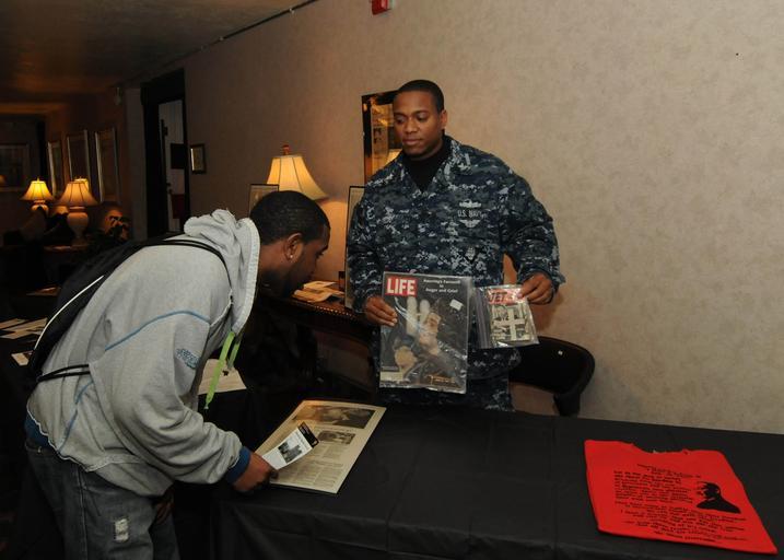 Keywords: Dr. Martin Luther King Jr. memorial day in Norfolk DVIDS362443.jpg en Petty Officer 1st Class Marlondos Fields logistics specialist right displays his collection of Dr Martin Luther King Jr memorabilia after a program honoring King's accomplishments at Naval Station Norfolk Diversity committee members from Naval Station Norfolk enacted skits depicting the civil rights movement and Rev Joyce Nyhaug spoke about King's achievements and the importance of keeping 'the dream' alive 2011-01-28 U S Navy photo by Petty Officer 3rd Class Stuart Phillips https //www dvidshub net/image/362443 110128-N-+++++-087 2011-02-01 17 52 NORFOLK VA US PD-USGov-Military-Navy Naval Station Norfolk Images from DoD uploaded by Fæ |