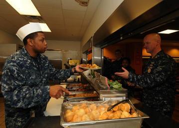 Keywords: Dr. Martin Luther King Jr. memorial day in Norfolk DVIDS362444.jpg en Petty Officer 3rd Class Justin Allen culinary specialist serves Naval Station Norfolk Command Master Chief David B Carter at the base galley during a commemorative meal for Dr Martin Luther King Jr During a program honoring King diversity committee members from Naval Station Norfolk enacted skits depicting the civil rights movement and Rev Joyce Nyhaug spoke about King's achievements and the importance of keeping 'the dream' alive 2011-01-28 U S Navy photo by Petty Officer 3rd Class Stuart Phillips https //www dvidshub net/image/362444 110128-N-+++++-111 2011-02-01 17 52 NORFOLK VA US PD-USGov-Military-Navy Naval Station Norfolk Images from DoD uploaded by Fæ |