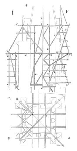 Keywords: Echafaud.suspendu.png Habituellement les tours des grandes églises sont dans leur partie supérieure à la hauteur des beffrois sous les flèches percées sur chaque face de doubles baies étroites et longues Les angles sont renforcés de contre-forts terminés par des pinacles; mais dans les angles rentrants formés par ces contre-forts et suivant les diagonales du carré sur lequel le plan de ces tours est tracé on remarque presque toujours à la base des beffrois des trous plus ou moins grands et quelquefois des repos Au-dessus de la partie verticale des tours à la base des flèches qui s'élèvent sur plan octogonal on voit sur les huit faces des lucarnes des issues plus ou moins larges mais étroites et longues Ces dispositions nous conduisent à admettre que les échafauds destinés à élever les parties supérieures et dégagées des tours d'églises étaient suspendus c'est-à-dire qu'ils laissaient la partie inférieure des façades complétement libre Partant de ce principe soit A 6 le plan d'une tour de façade d'une grande église à la base du beffroi et B le plan de cette tour à la base de la flèche en pierre qui la couronne Wooden scaffolding |
