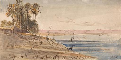 Keywords: Edward Lear - Near Edfu or Kilh - Google Art Project.jpg inscribed in brown ink lower left Near Edfoo or Kilh - 4 P M 25 Jany 1867 Palms catch light ; in brown ink lower right '226 ; verso in graphite cener 161 Not on View Watercolor with pen in brown ink over graphite on medium slightly textured wove paper mounted on thick slightly textured cream wove paper sky palm trees water wall river riverbank hill landscape boats special url_id uQGBbaHLKw97bw PD-old-100-1923 1888 Egypt by Edward Lear Google Art Project works by Edward Lear Egyptian feluccas in art |