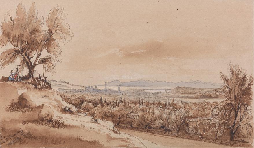 Keywords: Edward Lear - Nice from the Genoa Road - Google Art Project.jpg Inscribed in pen with brown ink lower left Nice from the Genoa Road Not on View Watercolor with pen in brown ink over graphite on medium slightly textured beige wove paper sky water grass mountains trees road cityscape figures representations landscape special url_id bQEA7B0N3UCRAg PD-old-100-1923 1888 Watercolor paintings by Edward Lear Google Art Project works by Edward Lear |