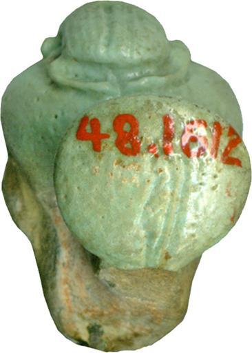 Keywords: Egyptian - Head of Pataikos with Scarab - Walters 481612 - Back.jpg This dwarf-like protective deity was very popular in ancient Egypt; amulets in the shape of this god were particularly popular from the Third Intermediate period The Greek name Pataikos comes from a passage in the writings of Herodotus ca 5th century BC who used this term to describe a Phoenician protective dwarf-like image The Egyptian Pataikos is a special manifestation of the creator god Ptah and the dwarf-like appearance symbolizes his magical power This head belongs to an unusual variant of Pataikos representing him with a snake in his mouth which winds its way up to his ears The god has a scarab on his head The fragment once belonged to a group of figures standing back to back late 4th-early 3rd century BC early Greco-Roman Egyptian faience with pale green glaze cm 2 1 1 2 1 7 accession number 48 1612 18052 Henry Walters Baltimore date and mode of acquisition unknown Walters Art Museum Henry Walters Acquired by Henry Walters Daily Magic in Ancient Egypt The Walters Art Museum Baltimore 2006-2007 place of origin Egypt Walters Art Museum license Ancient Egyptian amulets in the Walters Art Museum Ancient Egyptian faience in the Walters Art Museum Pataikos |