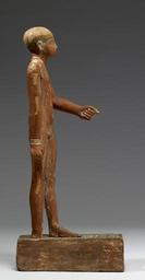Keywords: Egyptian - Imti Standing - Walters 2224 - Right Side.jpg Patrons occasionally commissioned sculptors to show them at a particular time of life Imti is represented as a youth with close-cropped hair A necklace of alternating white and black beads with amulet and a blue bracelet bordered in white and black adorn his otherwise nude body Nudity may also suggest rebirth into the afterlife Typical of wooden statues the arms and front of the feet were carved separately and attached to the body or base with pegs The boy is depicted striding with his left foot forward His right arm is at his side and his left arm is bent forward to hold a staff which is missing The head is shaven and the hairline and hair tufts are represented by a black line and black points respectively The whole figure is covered with a thin layer of red-brown paint chipped off in many pieces The finger-nails are painted white and two black dots above the buttocks indicate dimples The base is red with a black top and is incised with hieroglyphs filled in with white The inscription on the base names the owner of the statue The arms are inset and fastened with wooden nails The feet are made separately and are fastened to the base with wooden nails ca 1900 1800 BC Middle Kingdom carved wood polychromy cm 36 8 15 5 accession number 22 24 6613 Dikran Kelekian New York and Paris Henry Walters city Baltimore Walters Art Museum Henry Walters Acquired by Henry Walters 1917 Translation Revered before Osiris Imti the blessed place of origin Egypt Walters Art Museum license Ancient Egyptian statues in the Walters Art Museum |
