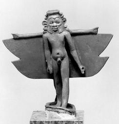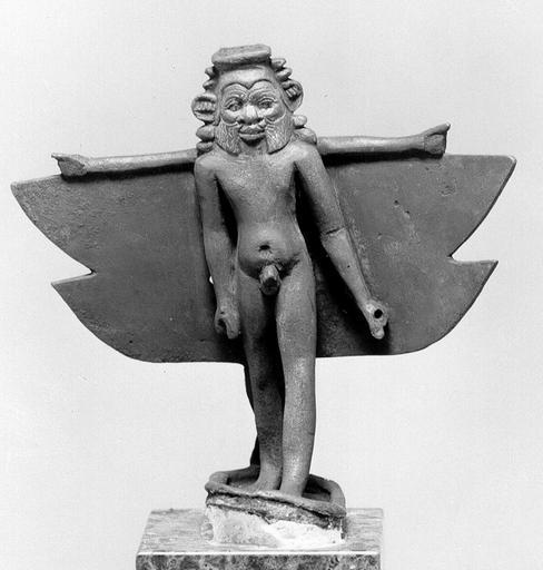 Keywords: Egyptian - Pantheistic Bes - Walters 541019 - Three Quarter.jpg This dwarf-like protective deity was very popular in ancient Egypt Known from as early as the Middle Kingdom ca 2000 BC Bes was venerated as a protector of the home family and childbirth and for that reason figures prominently in domestic magic and amulets His close connection to all aspects of fertility and sexuality is demonstrated by the presence of his image in the Birth-houses -shrines associated with temples of the Late Period and the Greco-Roman era He also had a special relation to the goddess Hathor and performed in her retinue as a musician and dancer Bes is represented here as a composite deity He has the nude body of Horus the Child two pairs of wings and four arms two stretched to the sides on top of the wings and two hanging down in front of the body His head has the typical characteristics of Bes with lion mane and ears and a stylized beard On the sides of his head additional animal heads are depicted The eyes of the figure were originally inlaid with gold and his hands which are pierced once held objects perhaps swords century 3 2 BC Greco-Roman bronze cm 12 9 accession number 54 1019 22716 Henry Walters Baltimore date and mode of acquisition unknown Walters Art Museum Henry Walters Acquired by Henry Walters Flight Fantasy Faith Fact Dayton Art Institute Dayton 1953-1954 Daily Magic in Ancient Egypt The Walters Art Museum Baltimore 2006-2007 place of origin Egypt Walters Art Museum license Ancient Egyptian statues in the Walters Art Museum Statuettes of Bes