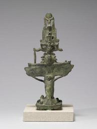 Keywords: Egyptian - Pantheistic Bes - Walters 54540 - Back.jpg This depicts a composite deity who has the attributes and therefore the powers of several different gods The face of the god Bes the twin plumes and ram horns of Amun's crown the head of an ibis crowned by the crescent and full moon of Thoth and several snakes and crocodiles can be seen The wings and falcon tail are related to the sky god Horus and the jackal Anubis There are many more aspects which refer to a multitude of divine aspects By incorporating these elements into a single figure the statuette protected the owner from many evils ca 250 100 BC Greco-Roman bronze cm 24 6 13 11 9 73 accession number 54 540 10883 Henry Walters city Baltimore Walters Art Museum Henry Walters Acquired by Henry Walters 1931 place of origin Egypt Walters Art Museum license Ancient Egyptian statues in the Walters Art Museum Statuettes of Bes Media contributed by the Walters Art Museum needs category review |