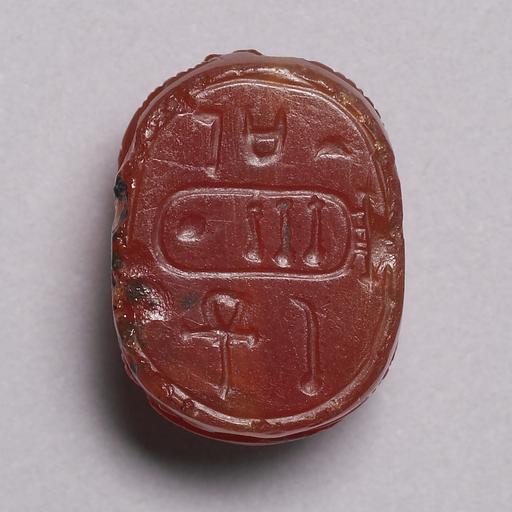 Keywords: Egyptian - Scarab of Neferu-Re - Walters 4256 - Bottom.jpg The ancient Egyptians believed that the dung beetle the Scarabaeus sacer was one of the manifestations of the sun god Representations of these beetles were used as amulets and for ritual or administrative purposes This small red carnelian scarab has a vertically arranged bottom inscription which consists of three lines of right reading text with a cartouche in the center An oval line frames the inscription The text contains the name and title of crown princess Neferure daughter of the female pharaoh Hatshepsut and a formula whishing her life The highest point of the back is the pronotum dorsal plate of the prothorax Pronotum and elytron wing cases have fine single borderlines and double separations lines The line flow almost regular only the partition lines between pronotum and elytron overlap slightly The trapezoidal head is flanked by quarter-ovoid eyes The trapezoidal side plates have curved outer edges and the clypeus front plate which is very large in comparison to the head has four frontal serrations and a central base notch The extremities show natural form and vertical hatch lines for the tibial teeth and pilosity hair the background between the legs is deeply hollowed out The oval base is symmetrical The scarab is longitudinally pierced and was originally mounted or threaded It functions as a name seal and user-individualized amulet of crown princess Neferure The scarab should secure the individual existence wish formula who may live divine relation title divine consort and royal status cartouche of the crown princess and the red color her magic protection The material carnelian was especially used for protective amulets and the Egyptians believed that it would intensify the magical potency The scarab could have been a personal amulet of the princess but it is also possible that it was given to a private person to guarantee the crown princess' patronage Scarabs made of dark red carnelian were popular for the female members of the court in early 18th Dynasty between 1479 1458 BC New Kingdom intensive red carnelian cm 1 4 1 1 0 9 accession number 42 56 1633 Henry Walters Baltimore date and mode of acquisition unknown Walters Art Museum Henry Walters Acquired by Henry Walters Translation Name of the crown princess Neferure in a cartouche combined with the priestess title and a wish formula Divine consort / Neferu-Re / who may live place of origin Egypt Walters Art Museum license Ancient Egyptian scarabs in the Walters Art Museum Hieroglyphs on scarabs Flag hieroglyph Well hieroglyph Bread bun t hieroglyph Sun hieroglyph Nfr symbol hieroglyph Ankh hieroglyph Pestle hieroglyph Scarabs with Wish Formula Neferure |