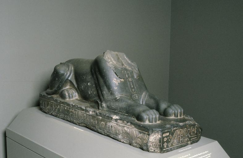 Keywords: Egyptian - Sphinx of King Psamtik II - Walters 22104 - Three Quarter.jpg Sphinxes served as temple figures Combining the muscular body of a reclining lion with the head of a royal human the sphinx was a powerful symbol of the ancient Egyptian concept of divine kingship Although now headless this sphinx retains part of its striped nemes head cloth worn only by Egypt's monarchs and meant to represent a hooded cobra a royal symbol Originally created for another king the sphinx's first inscription was replaced by one naming King Psamtik II between 664 589 BC Late Period greywacke cm 39 94 28 5 accession number 22 104 33156 Dikran Kelekian New York and Paris Henry Walters city Baltimore Walters Art Museum Henry Walters Acquired by Henry Walters 1909 place of origin Thebes in present-day Egypt Walters Art Museum license Ancient Egyptian statues in the Walters Art Museum Psammetichus II Statues of Egyptian sphinxes Statues of the 26th dynasty of Egypt Ancient Egyptian art made from greywacke |