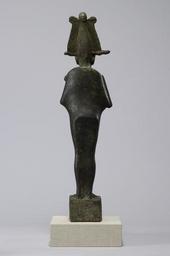 Keywords: Egyptian - Statue of Osiris - Walters 54551 - Back.jpg The god of resurrection Osiris reigned supreme in the underworld He combined the elements of death regeneration and fertility in his mythology He was also connected with crops and the annual floods Osiris took on funerary associations when he was linked with other underworld gods as his cult spread across the land This combination of fertility and funerary aspects made Osiris the principal god of the dead One of his titles is chief of the westerners the west being the domain of the dead Here the god is shown in his standard iconography attired in a mummiform garment his hands projecting from the wrappings to hold the royal insignia of crook and flail He wears the elaborate atef crown-composed of the tall white crown double plumes ram horns and uraeus sacred cobra -as well as a ceremonial braided beard This statue is of extraordinary size ca 580 550 BC Late Period hollow cast bronze cm 60 96 14 accession number 54 551 36613 Dikran Kelekian New York and Paris date and mode of acquisition unknown Henry Walters city Baltimore Walters Art Museum Henry Walters Acquired by Henry Walters 1914 place of origin Upper Egypt Walters Art Museum license Ancient Egyptian statues in the Walters Art Museum Statues of the Egyptian late period Statues of Osiris Media contributed by the Walters Art Museum needs category review |