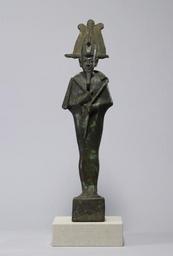 Keywords: Egyptian - Statue of Osiris - Walters 54551.jpg The god of resurrection Osiris reigned supreme in the underworld He combined the elements of death regeneration and fertility in his mythology He was also connected with crops and the annual floods Osiris took on funerary associations when he was linked with other underworld gods as his cult spread across the land This combination of fertility and funerary aspects made Osiris the principal god of the dead One of his titles is chief of the westerners the west being the domain of the dead Here the god is shown in his standard iconography attired in a mummiform garment his hands projecting from the wrappings to hold the royal insignia of crook and flail He wears the elaborate atef crown-composed of the tall white crown double plumes ram horns and uraeus sacred cobra -as well as a ceremonial braided beard This statue is of extraordinary size ca 580 550 BC Late Period hollow cast bronze cm 60 96 14 accession number 54 551 36613 Dikran Kelekian New York and Paris date and mode of acquisition unknown Henry Walters city Baltimore Walters Art Museum Henry Walters Acquired by Henry Walters 1914 place of origin Upper Egypt Walters Art Museum license Ancient Egyptian statues in the Walters Art Museum Statues of the Egyptian late period Statues of Osiris Braided beards |