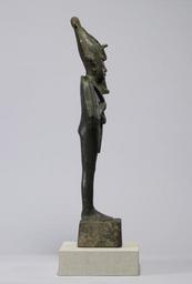 Keywords: Egyptian - Statue of Osiris - Walters 54551 - Right Profile.jpg The god of resurrection Osiris reigned supreme in the underworld He combined the elements of death regeneration and fertility in his mythology He was also connected with crops and the annual floods Osiris took on funerary associations when he was linked with other underworld gods as his cult spread across the land This combination of fertility and funerary aspects made Osiris the principal god of the dead One of his titles is chief of the westerners the west being the domain of the dead Here the god is shown in his standard iconography attired in a mummiform garment his hands projecting from the wrappings to hold the royal insignia of crook and flail He wears the elaborate atef crown-composed of the tall white crown double plumes ram horns and uraeus sacred cobra -as well as a ceremonial braided beard This statue is of extraordinary size ca 580 550 BC Late Period hollow cast bronze cm 60 96 14 accession number 54 551 36613 Dikran Kelekian New York and Paris date and mode of acquisition unknown Henry Walters city Baltimore Walters Art Museum Henry Walters Acquired by Henry Walters 1914 place of origin Upper Egypt Walters Art Museum license Ancient Egyptian statues in the Walters Art Museum Statues of the Egyptian late period Statues of Osiris Braided beards |