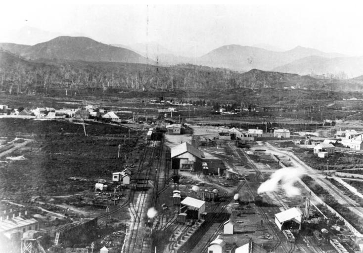 Keywords: train railway tasmania zeehan station blackandwhite monochrome outdoor black and white An early overview of Zeehan station looking south showing the 3ft 6in Government and Emu Bay lines in the centre with an EBR train arriving and the 2ft gauge North East Dundas yards to the right. TGR photo 4S26. Ted Lidster collection An early overview of Zeehan station looking south showing the 3ft 6in Government and Emu Bay lines in the centre with an EBR train arriving and the 2ft gauge North East Dundas yards to the right. TGR photo 4S26. Ted Lidster collection |