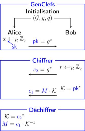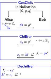 Keywords: ElGamal Diffie Hellman Illustration French.svg en Comparison between El Gamal and Diffie-Hellman key exchange + one-time pad fr Comparaison entre El Gamal et l ™Ă©change de clef de Diffie-Hellman + Masque jetable own Chouhartem 2016-08-22 Done with LaTeX tikz and pdf2svg Cc-zero Cryptography diagrams |