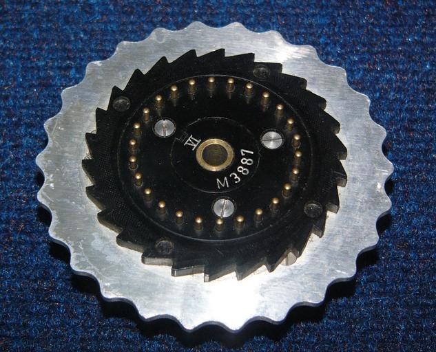 Keywords: Enigma-rotor-BP.jpg A rotor from an en Enigma machine showing the outer finger grooves the ratchet notches and the circle of 26 pins A Roman numeral VI is visible on the rotor indicating that this was a Naval Enigma rotor This rotor was on display at en Bletchley Park museum Original photograph by en User Matt Crypto released into the public domain en wikipedia 2005-01-01 Matt Crypto wikipedia en Matt Crypto original upload log page en wikipedia Enigma-rotor-BP jpg 2005-01-01 18 18 Matt Crypto 2055×1661×8 555312 bytes <nowiki>An Enigma rotor Original photograph by User Matt Crypto PD </nowiki> Enigma machine rotors |