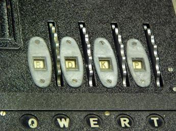 Keywords: Enigma-rotor-windows.jpg Close-up of the rotor windows of a four-rotor Naval Enigma machine M4 Walzenfenster der ENIGMA-M4 Figure 2 With the inner lid placed down the Enigma is ready for use The finger wheels of the rotors protrude through the lid allowing the operator to set the rotors and the current position ” here <tt>RDKP</tt> ” is visible to the operator through a set of windows Zicht op de positie van de rotors bij een Kriegsmarine M4 model PierÅ›cienie rÄ™czne wystajÄ… przez obudowÄ™ umożliwiajÄ…c ustawienie bÄ™benków uploaded in english wikipedia on 31 Dec 2004 by author en User Matt Crypto released in PD by author Enigma-rotor-windows-cropped jpg Enigma-rotor-windows-cropped2 jpg - Matt Crypto Enigma machine rotors |