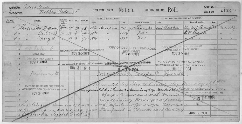 Keywords: Enrollment for Cherokee Census Card D123 - NARA - 251871.tif Local identifier 75-53A-CHEROKEE D123 Department of the Interior Office of Indian Affairs Office of the Commissioner to the Five Civilized Tribes 1893 - 1914 NARA's Southwest Region Fort Worth NRFA 1400 John Burgess Drive Fort Worth TX 76140 Record group Record Group 75 Records of the Bureau of Indian Affairs 1793 - 1999 Record group ARC 404 Enrollment Cards compiled 1898 - 1914 Series ARC 251747 Variant control numbers NAIL Control Number NRFF-75-53A-17389<br /> NAIL Control Number NRFF-75-53A-17397<br /> NAIL Control Number NRFF-75-53A-17402<br /> NAIL Control Number NRFF-75-53A-17405<br /> NAIL Control Number NRFF-75-53A-17415<br /> NAIL Control Number NRFF-75-53A-17420<br /> NAIL Control Number NRFF-75-53A-CHEROKEE D123 General notes Scope and content Name Elizabeth Shoemake Type Parent Sex Female Name Ja Shoemake Type Parent Sex Male Name Lulu B Shoemake Type Doubtful Age 19 Sex Female Degree Indian Blood 1/4 City of Residence Webber Falls Name Mary E Shoemake Type Doubtful Age 17 Sex Female Degree Indian Blood 1/4 City of Residence Webber Falls Name Sp Shoemake Type Parent Sex Female Name William H Shoemake Type Doubtful Age 75 Sex Male Degree Indian Blood 1/8 City of Residence Webber Falls File unit File unit ARC yes <gallery> File Enrollment_for_Cherokee_Census_Card_D123_-_NARA_-_251871 tif tif File Enrollment_for_Cherokee_Census_Card_D123_-_NARA_-_251871 jpg jpg </gallery> NARA-cooperation PD-USGov Cherokee census cards NARA TIF images with categorized JPGs |