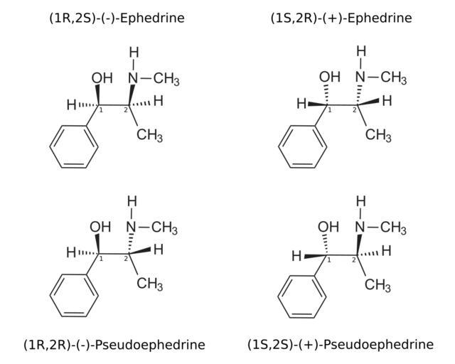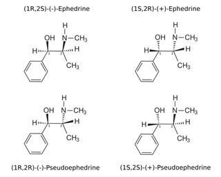 Keywords: Ephedrine pseudoephedrine isomers.svg en The four diastereoisomers of ephedrine Top ephedrine<br> Bottom pseudoephedrine<br> IUPAC Name 2- methylamino -1-phenylpropan-1-ol The stereocenters are numbered own Wickey-nl 2009-12-15 Inkscape validSVG Ephedrine Pseudoephedrine |