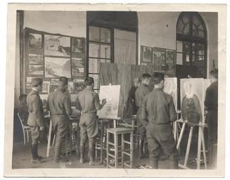 Keywords: smithsonian institution smithsonianinstitution art class artclass portrait class portraitclass painter artists uniforms black and white photo blackandwhitephoto archives of american art archivesofamericanart black and white Description: Group photo of the "Portrait Class", men dressed in uniform working at easels. Peixotto is at far left. Identification on verso (handwritten): The Portrait Class; Ernest Peixotto. Peixotto, Ernest, 1869-1940 Creator/Photographer: Unidentified photographer Medium: Black and white photographic print Dimensions: 17 cm x 22 cm Date: c. 1915 Persistent URL: www.aaa.si.edu/collections/images/detail/ernest-peixotto-... Repository: Archives of American Art Collection: Charles Scribner's Sons Art Reference Department Records, c. 1865-1957 Accession number: aaa_charscrs_4327 Description: Group photo of the "Portrait Class", men dressed in uniform working at easels. Peixotto is at far left. Identification on verso (handwritten): The Portrait Class; Ernest Peixotto. Peixotto, Ernest, 1869-1940 Creator/Photographer: Unidentified photographer Medium: Black and white photographic print Dimensions: 17 cm x 22 cm Date: c. 1915 Persistent URL: www.aaa.si.edu/collections/images/detail/ernest-peixotto-... Repository: Archives of American Art Collection: Charles Scribner's Sons Art Reference Department Records, c. 1865-1957 Accession number: aaa_charscrs_4327