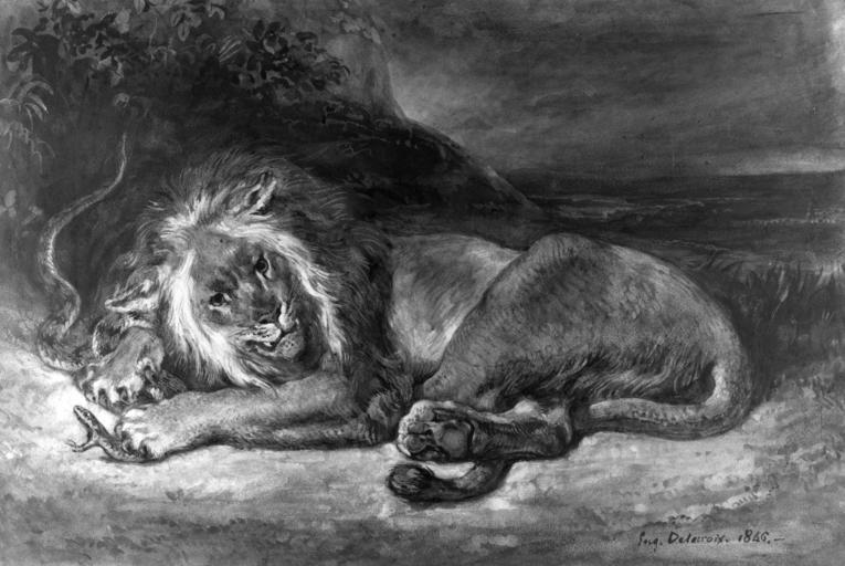 Keywords: Eugène Delacroix - Lion and Snake - Walters 371219.jpg Delacroix's Lion and Snake is one of an important series of feline images that the artist created around mid-century and imparts an anthropomorphic view of the animal world based on contemporary science The reclining lion traps a snake deftly against the ground with his two front paws as he gazes almost contemplatively away from his victim The snake on the other hand writhes in pain as he attempts free himself from the lion's grasp Delacroix integrates the action with dark forms in the background which emphasize the lion's contour and with areas of light in the sky which underscore highlights in the lion's paws face and body The pose and the features of the cat's head particularly the nostrils and eyes derive from Delacroix's lion in his mural Justice in the Salon du Roi at the Palais Bourbon in Paris completed in 1838 If Lion and Snake and its source are allegories of justice over malevolence the Walters Art Museum's lion suggests human introspection whereas the Palais Bourbon's lion expresses brute force 1846 watercolor heightened with gum on slightly textured moderately thick cream wove paper cm 38 7 59 accession number 37 1219 3360 Mahler Collection J Montaignac William T Walters Baltimore March 22 1888 by purchase George A Lucas as agent Henry Walters city Baltimore Walters Art Museum Henry Walters Acquired by William T Walters 1888 Eug Delacroix 1846 technique black watercolor signature/date ~ lower right Exhibited at the Salon 1846 Louvre The Essence of Line The Works of Antoine-Louis Barye American Art Gallery New York New York 1889-1890 From Ingres to Gauguin French Nineteenth Century Paintings Owned in Maryland Baltimore Museum of Art Baltimore 1951 Hommage à Baudelaire Art Gallery University of Maryland College Park 1968 A Supple Brush The Flowering of Continental Watercolors The Walters Art Gallery Baltimore 1979 A Connoisseur's Portfolio French Masterworks on Paper The Walters Art Gallery Baltimore 1992 French Master Drawings The Walters Art Gallery Baltimore 1997-1998 place of origin France Walters Art Museum license 2D A Connoisseur's Portfolio The Essence of Line Drawings by Eugène Delacroix French paintings in the Walters Art Museum Lions in art Salon of 1846 1840s paintings from France 1846 paintings |