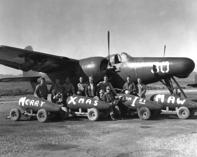 Keywords: F7F-3N XMas 1950 Korea.jpeg A group of Ohio Marines serving with the 1st Marine Aircraft Wing in Korea are shown with their Yuletide gift to Korean and Chinese Reds original caption in front of a U S Marine Corps Grumman F7F-3N Tigercat in December 1950 Left to right are M/Sgt Robert T Hunt 1st Lt David W Bowman M/Sgt Thomas H Allom Lt Arnold J Hammons Lt Walter J Waldo Capt Leland A Gaug Capt William G Diar Jr M/Sgt William R Goodall III and Maj George A Hanna U S www defenseimagery mil photo no HM-SN-98-06695; NARA file no 127-GK-4-A132638 1950-12 Camera Operator MSgt Charles D Prindle USMC PD-USGov Grumman F7F Tigercat Night fighter aircraft Black and white photographs of aircraft |