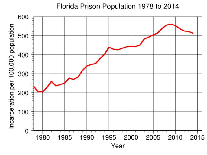Keywords: Florida Prison Population.svg en Florida prison incarceration rate per 100 000 population from 1978 to 2014 Data from http //www bjs gov/index cfm ty nps BJS own Delphi234 2016-05-10 current annually Generated with Wikimedia SVG Chart SVG Chart/box Cc-zero Prisons in Arizona Imprisonment and detention rates in the United States |
