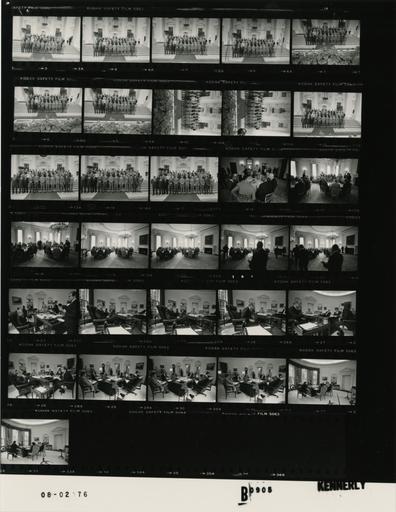 Keywords: Ford B0905 NLGRF photo contact sheet (1976-07-31)(Gerald Ford Library).jpg White House Photographic Office WHPO is housed at the Gerald R Ford Presidential Library a branch of the National Archives and Records Administration NARA <br/><br/> This file is a 200 dpi photo contact sheet having images from roll of film B0905 of the August 9 1974 - January 20 1977 Gerald R Ford White House Photographic Office Series A0001-A9999 and B0001-B2886 photographs <br/><br/> The date on the photo contact sheet is the date the roll of film was processed not necessarily the date the photographs were taken See table below for additional details 1976-07-31 Gerald R Ford Presidential Library Image http //www fordlibrarymuseum gov/library/whphotos/B0905_NLGRF jpg B0905_NLGRF jpg from http //www fordlibrarymuseum gov/library/whphotos/19760731whpo pdf White House Photographs July 31 1976 of the http //www fordlibrarymuseum gov/Library/whphotos/whpo asp White House Photographic Collection page White House Photographic Office WHPO <br/> Creator David Hume Kennerly PD-USGov Institution Institution Gerald R Ford Presidential Library Table wikitable sortable + Photo contact sheet B0905 U S President Ford Administration Gerald R Ford Library Frame s Tone Subject proper Subject generic Names Geographic Location Photographer Date - 3-15 BW Reunion of Yale University Phi Delta Phi Fraternity standing posing on steps GRF Aller Badger Belin Bellows Berry Brown Burns Caesar Calder Clapp Craig Crawford Deming Dempsey Dilworth Ebersol Ecklund Everdell French Gallagher Galland Gary Hallett Hessberg Hornblower Hutson Keefe Kluttz Lamb Others North Portico -Steps Kennerly 1976-07-31 - 16-22 BW Luncheon During Reunion of Yale University Phi Delta Phi Fraternity seated at tables eating talking; various angles and distances; all not in frames GRF Aller Badger Belin Bellows Berry Brown Burns Caesar Calder Clapp Craig Crawford Deming Dempsey Dilworth Ebersol Ecklund Everdell French Gallagher Galland Gary Hallett Hessberg Hornblower Hutson Keefe Kluttz Lamb Others State Dining Room Kennerly 1976-07-31 - 23-33 BW Staff Meeting seated around desk; various angles and distances; all not in every frame GRF Jerry Jones Timmons William Rhatican Stanton Anderson Royston Hughes Oval Office Kennerly 1976-07-31 Gerald R Ford Presidential Library and Museum-cooperation PD-USGov Contact sheets by the Ford White House July 1976 Photographs by David Hume Kennerly from 1976 |