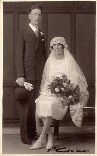 Keywords: Fred C Palmer 104.jpg Portrait photo of a wedding couple at Swindon Wiltshire England in the 1920s or 30s From a postcard deposited at Swindon Record Office and scanned and uploaded by them to Flickr The photographer was Fred C Palmer of Tower Studio Herne Bay Kent ca 1905-1916 and of 6 Cromwell Street Swindon ca 1920-1936 He is believed to have died 1936-1939 Border The remaining border of this image is important for researchers of this photographer Some photographers trimmed their images more than others and Palmer has a reputation for producing smaller postcards than other early 20th century UK photographers He took his own photos developed them in-house onto postcard-backed photographic paper and trimmed them himself It is worth adding that during hand-developing the border is actively masked with equipment which both crops the picture and causes the white frame or border to appear on the paper This frame is part of the design and is one of the reasons why the quality of Palmer's work is so interesting and why there is an article and category for him on English Wiki Researchers need to see exactly where the edge of the postcard is Thank you for taking the time to read this http //www flickr com/photos/swindonlocal/4456885399/ 1920-1930s Fred C Palmer died 1936-1939 out of copyright PD-art-70 Fred C Palmer of Swindon Black and white photographs of marriage Wedding ceremonies in the United Kingdom |