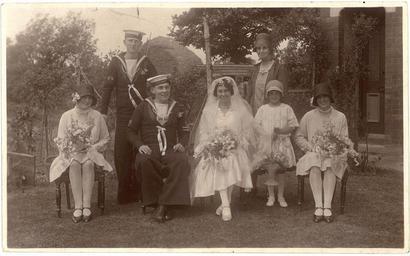 Keywords: Fred C Palmer Campion King wedding Swindon 1929.jpg Portrait photo of Campion-King wedding at Swindon Wiltshire England in 1929 From a postcard deposited at Swindon Record Office and scanned and uploaded by them to Flickr The photographer was Fred C Palmer of Tower Studio Herne Bay Kent ca 1905-1916 and of 6 Cromwell Street Swindon ca 1920-1936 He is believed to have died 1936-1939 Points of interest The sailor-groom is from the aircraft carrier HMS Eagle which was serving in the Mediterranean Fleet in 1929 In the previous year his captain and commander had been tried on board ship at Gibraltar for the Royal Oak Mutiny The ship's name on the other sailor's hat is illegible but it's a longer name ending in L ; possibly HMS Cornwall which in 1929 was at the China Station In the background there is either a hayrick or a thatched roof Border The remaining border of this image is important for researchers of this photographer Some photographers trimmed their images more than others and Palmer has a reputation for producing smaller postcards than other early 20th century UK photographers He took his own photos developed them in-house onto postcard-backed photographic paper and trimmed them himself It is worth adding that during hand-developing the border is actively masked with equipment which both crops the picture and causes the white frame or border to appear on the paper This frame is part of the design and is one of the reasons why the quality of Palmer's work is so interesting and why there is an article and category for him on English Wiki Researchers need to see exactly where the edge of the postcard is Thank you for taking the time to read this http //www flickr com/photos/swindonlocal/4711802616/in/set-72157624432006851/ 1929 Fred C Palmer died 1936-1939 out of copyright PD-art-70 Fred C Palmer of Swindon People of Swindon 1929 in the United Kingdom History of Swindon Wedding portrait photographs Wedding ceremonies in the United Kingdom |