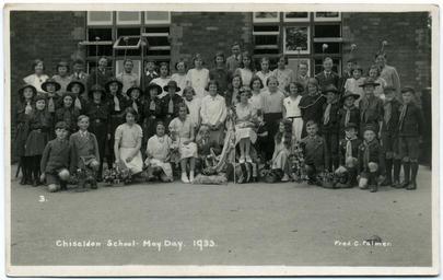 Keywords: Fred C Palmer Chiseldon School 1933 003.jpg 1933 postcard of Chiseldon School near Swindon Wiltshire England showing a group of school children dressed for May Day celebrations It is one of a set of seven postcards from the 1930s showing children from the same school on May Day There is a May Queen; also Brownies Cubs Scouts and Girl Guides The photographer was Fred C Palmer of Tower Studio Herne Bay Kent ca 1905-1920 and of 6 Cromwell Street Swindon ca 1920-1936 He is believed to have died 1936-1939 This print has darkened with age but it would be inappropriate to adjust the brightness because detail e g on white dresses would be lost Border The remaining border of this image is important for researchers of this photographer Some photographers trimmed their images more than others and Palmer has a reputation for producing smaller postcards than other early 20th century UK photographers He took his own photos developed them in-house onto postcard-backed photographic paper and trimmed them himself It is worth adding that during hand-developing the border is actively masked with equipment which both crops the picture and causes the white frame or border to appear on the paper This frame is part of the design and is one of the reasons why the quality of Palmer's work is so interesting and why there is an article and category for him on English Wiki Researchers need to see exactly where the edge of the postcard is Thank you for taking the time to read this Scan of original postcard in my possession Marked 1933 Fred C Palmer died 1936-1939 out of copyright File Fred C Palmer Chiseldon School 1930s 001 jpg <br/> File Fred C Palmer Chiseldon School 1933 001 jpg <br/> File Fred C Palmer Chiseldon School 1933 002 jpg <br/> File Fred C Palmer Chiseldon School 1934 001 jpg <br/> File Fred C Palmer Chiseldon School 1934 002 jpg <br/> File Fred C Palmer Chisledon School 1934 003 jpg PD-art-70 Fred C Palmer of Swindon Chiseldon People of Wiltshire School children of the United Kingdom 1st of May in the United Kingdom People in 1933 |