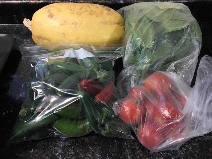 Keywords: My friend Bill shared with me from the last gleanings of his massive garden - from top left-- spaghetti squash, lettuce, tomatoes, and a big bag of peppers My friend Bill shared with me from the last gleanings of his massive garden - from top left-- spaghetti squash, lettuce, tomatoes, and a big bag of peppers |