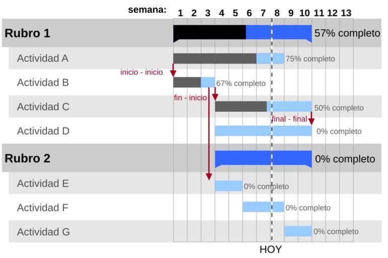 Keywords: GanttChartAnatomyES.svg en A Gantt chart showing three kinds of schedule dependencies in red percent complete indications and activity groups es Diagrama de Gantt mostrando tres tipos de precedencias en rojo porcentajes de avance y agrupación de actividades en rubros traducción del archivo original en inglés en wikimedia commons http //en wikipedia org/wiki/File GanttChartAnatomy svg 2011-12-19 Garrybooker > Malyszkz > Mario Fèvre 2011-12-19 http //en wikipedia org/wiki/File GanttChartAnatomy svg Cc-zero Gantt charts |
