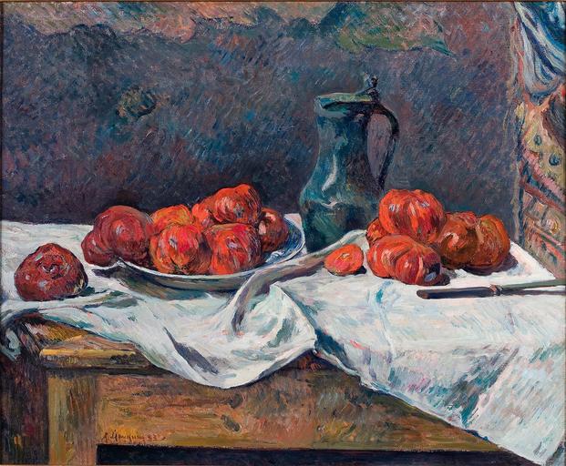Keywords: Gauguin 1883 Tomates et pot d'étain sur une table.jpg Artwork Creator Paul Gauguin Tomates et pot d'étain sur une table ou Nature morte aux tomates Tomàquets i gerro d'estany sobre una taula o Natura morta amb tomàquets Tomatoes and a Pewter Tankard on a Table 1883 oil on canvas cm 60 73 object history exhibition history P Gauguin 83 signature / date lower left ~ Dickinson Gallery London and New York Gauguin catalogues 90 107 PD-old-100-1923 Paintings by Paul Gauguin in private collections 1880s paintings by Paul Gauguin 1883 paintings Still life paintings by Paul Gauguin |