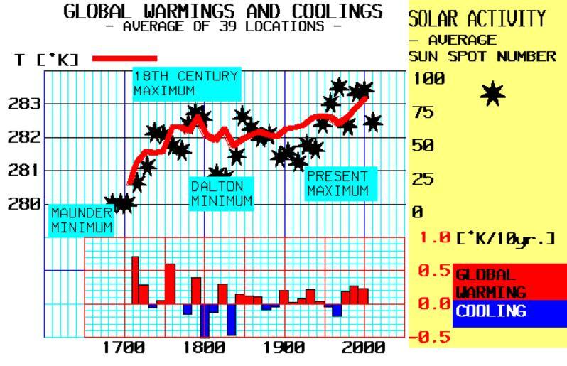 Keywords: Global warmings and coolings 1700-2007.gif carbon dioxide emitted by human industrial activity and the intensity of global cooling / warming of the Earth's surface The most intense period of global warming was in the eighteenth century when industrial activity almost did not exist Global cooling on Earth began in the beginning of the nineteenth and in middle of twentieth century were not correlated with retrogressions of industrial activity which could cause a reduction in the amount of coal burned and CO<sub>2</sub> emissions in those periods The only positive correlation in this case is the relationship between the average temperature of the surface of the Earth and the Sun activity measured as the intensity of observed changes OF the average sunspots number the Wolf number thumb Globalne ocieplenia i oziębienia 1700-2007 Wykres pokazuje że w ciągu ostatnich trzech stuleci w przeciwieństwie do wielu opinii na ten temat nie ma korelacji między ilością CO<sub>2</sub> dwutlenku węgla emitowanego do atmosfery przez człowieka podczas działalności przemysłowej i intensywnością globalnych oziębień / ociepleń powierzchni Ziemi Najbardziej intensywny okres globalnego ocieplenia był w XVIII wieku kiedy działalność przemysłowa prawie nie istniała Globalne oziębienia które rozpoczynały się na Ziemi na początku XIX i w połowie XX wieku nie były skorelowane z regresami działalności przemysłowej które mogłyby zmniejszyć ilość emisji CO<sub>2</sub> w tamtym czasie Jedyną pozytywną korelacją w tym przypadku jest związek pomiędzy zmianami średniej temperatury powierzchni Ziemi i intensywnością aktywności Słońca mierzonej zmianami średniej liczby plam słonecznych zwanej liczbą Wolfa Own work by uploader based on source-data http //www wetterzentrale de/klima Wkobylinski 2008-06-02 Wiktor Kobyliński Natural reason of climate change Global cooling Global warming graphs Greenhouse effect |