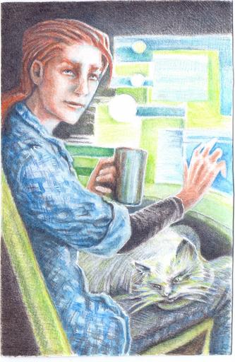 Keywords: graphics watercolor watercolor pencils illustration figure cat guy portrait man young computer armchair mug redhead