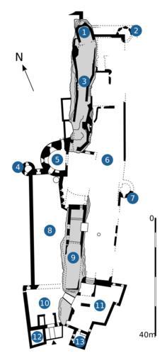 Keywords: Grundriss Schoeneck.svg Grundriss der elsässischen Burg Schöneck bei Dambach own <br /> Vorlagen u a Charles-Laurent Salch Nouveau Dictionnire des Châteaux Forts d ™Alsace Alsatia 1991 ISBN 2-7032-0193-1 p 292; Thomas Biller Bernhard Metz Der spätromanische Burgenbau im Elsaß 1200 “1250 München/Berlin Deutscher Kunstverlag 2007 ISBN 978-3-422-06635-9 p 405 Models i a Charles-Laurent Salch Nouveau Dictionnire des Châteaux Forts d ™Alsace Alsatia 1991 ISBN 2-7032-0193-1 p 292; Thomas Biller Bernhard Metz Der spätromanische Burgenbau im Elsaß 1200 “1250 München/Berlin Deutscher Kunstverlag 2007 ISBN 978-3-422-06635-9 p 405 2013-01-21 Sir Gawain - 1 Bergfried 2 Polygonaler Eckturm - 3 Nördliche Oberburg 4 Runder Eckturm - 5 Geschützturm 6 Östliche Unterburg - 7 Halbrunder Flankierungsturm 8 Westliche Unterburg - 9 Südliche Oberburg 10 Westlicher Zwinger - 11 Östliche Zwinger 12 Westlicher Flankierungsturm - 13 Östlicher Flankierungsturm Château de SchÅ“neck Plans of castles in Alsace |