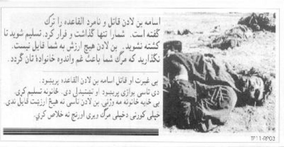 Keywords: GWOT Demoralization Leaflet TF11RP03 back.jpeg en Back of US Government leaflet meant to demoralize Taliban and Al-Qaeda by showing they were dying as Osama Bin Laden deserted them 2002-01 http //www psywarrior com/DivideandConquer html Federal Government PD-USGov Government propaganda Uploaded with UploadWizard |