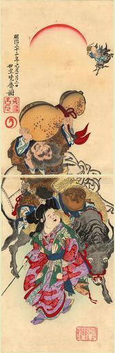 Keywords: Gyosai Daikoku.jpg Kyosai Daikoku 2 January 1889 Diptych 9 by 28 The print depicts three of the Gods of Good Fortune Daikoku rides an ox led by Otafuku and Hotei appears in the sky From http //www japaneseprints net/viewitem cfm ID 2147 here PD-Art Nishiki-e in Meiji period Kawanabe Kyosai Paintings on scrolls from Japan Oxen in art Paintings of Hotei Daikokuten Ame-no-Uzume-no-Mikoto Artworks missing infobox template |
