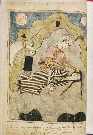 Keywords: H599, tavaqarashviliseuli vefxistkasoani, avtandili asmats danit ashinebs, 76v.jpg en avtandili asmats danit ashinebs A miniature by Mamuka Tavakalashvili from the manuscript of Shota Rustaveli's Knight in the Panther's Skin H599 76v National Center of Manuscripts Tbilisi Georgia ka แแแแแ แแแแ แแกแแแแก แแแ แแ แแจแแ แแแก http //www flickr com/photos/36292139 N03/3350299057/sizes/l/in/photostream/ Machavariani H Aleksidze Z The Decoration of Georgian Manuscripts Tbilisi 1990 creator Mamuka Tavakalashvili century 17 PD-old-100 The Knight in the Panther's Skin by Mamuka Tavakalashvili Georgia in the 17th century |
